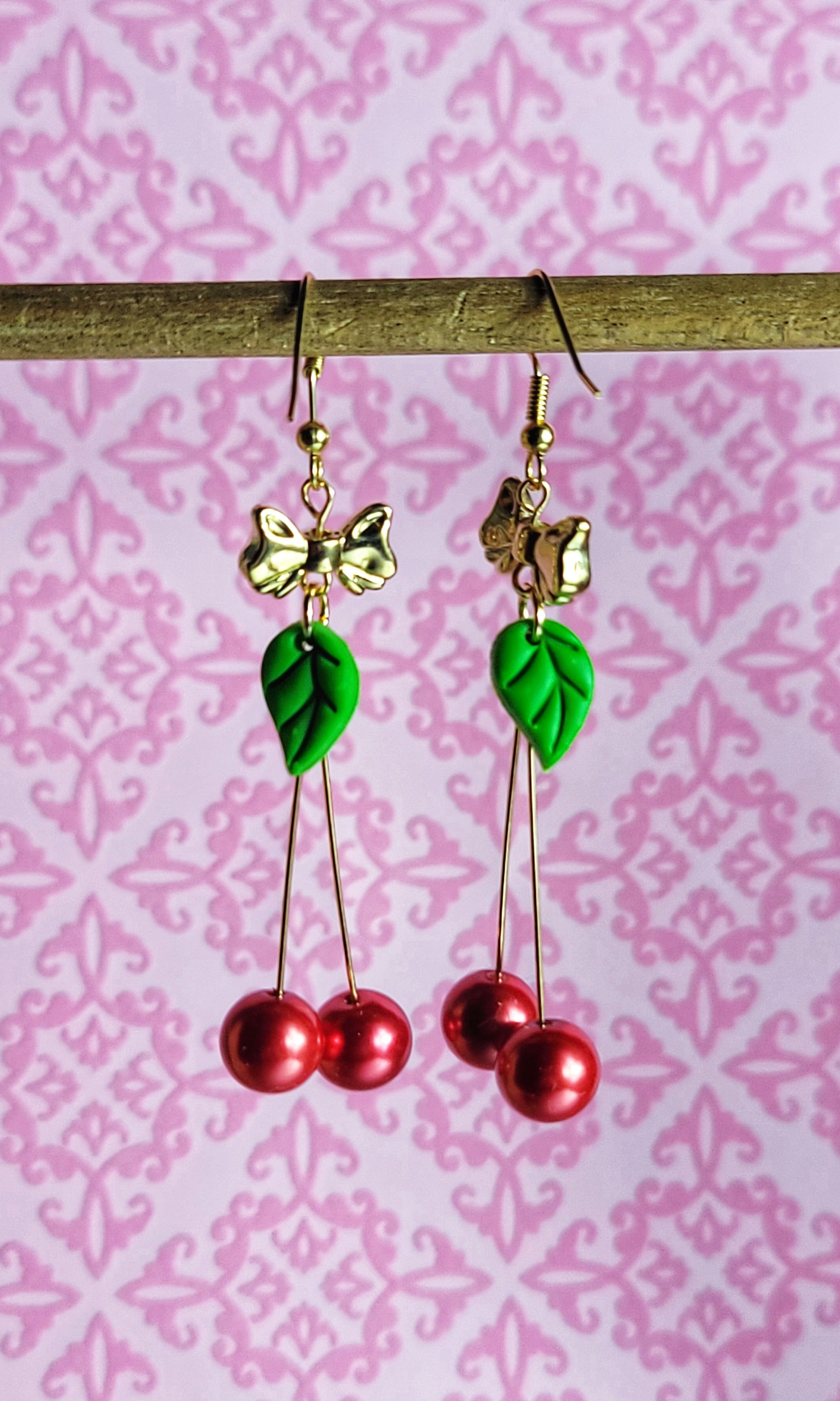 These cute gold finished earrings are made with a glass pearl and polymer clay leaf. A cute acrylic bow makes them pop.